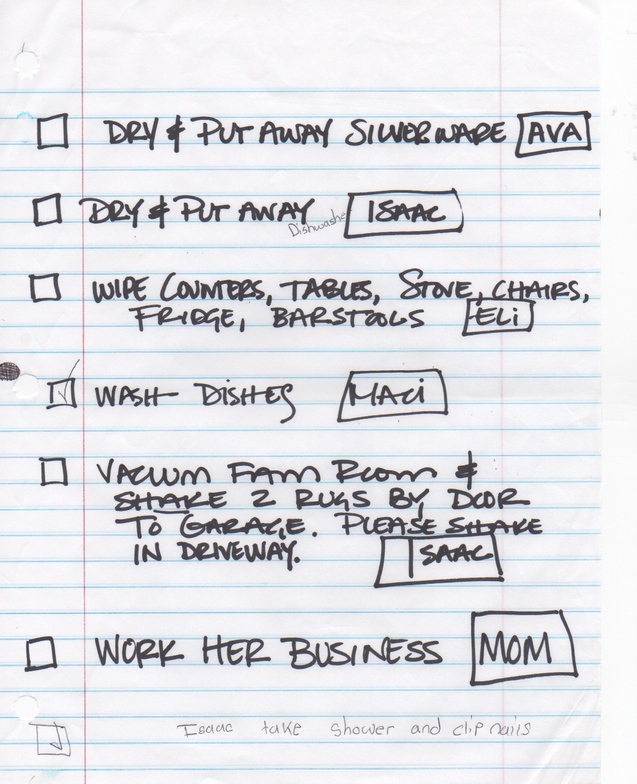 Now- to answer some common questions: "Did they really do all of that?" Well, I have not inspected as of yet, but as I type, two little secretaries are going around the house with the clipboard finding out why some of the boxes are not yet checked and doing some inspecting of their own. Kids that have chores done before dinner time, will be invited to my dinner table. The alternative: finish your chores while we enjoy mom's AMAZING dinner (leftovers) and make a PB&J when you're done. :-( So sad, but we support your decision to procrastinate. :-)